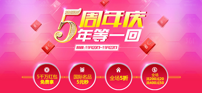 與此同時,為了感謝新老顧客五年來的支持,淘鞋網(wǎng)在本次周年慶期間推出了盛大的感恩回饋活動。(包括:5000萬紅包大放送,國際名品5元秒,超人氣爆款5折封頂、全場滿減等強力度活動。)