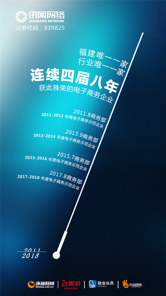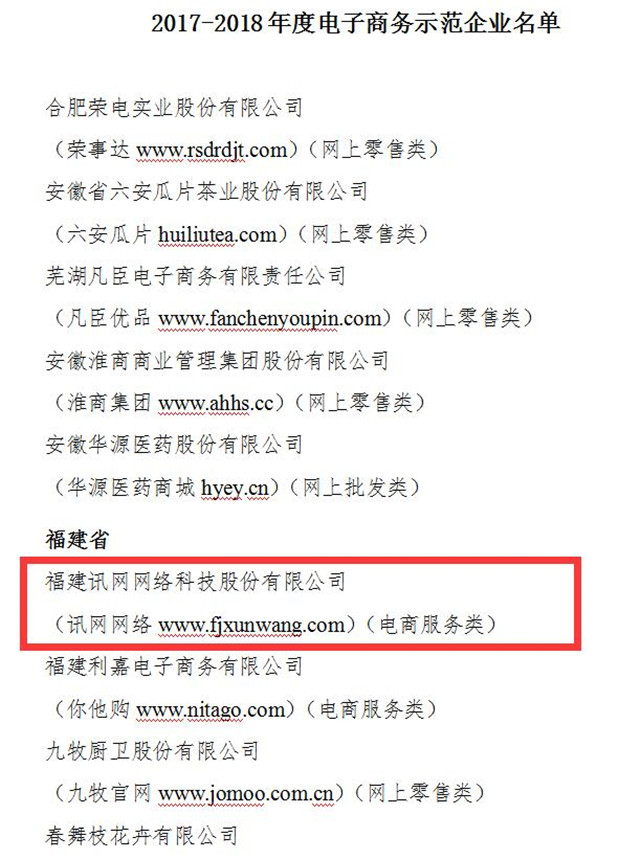 日前訊網網絡與阿里巴巴、京東、小米等239家知名企業共同入選國家商務部公布的《2017-2018年度電子商務示范企業》名單,且成為福建省唯一連續四次獲得此項國家級重要榮譽的企業。