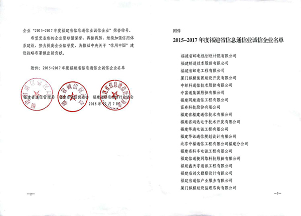 訊網榮獲“2015-2017年福建省信息通信業誠信企業”