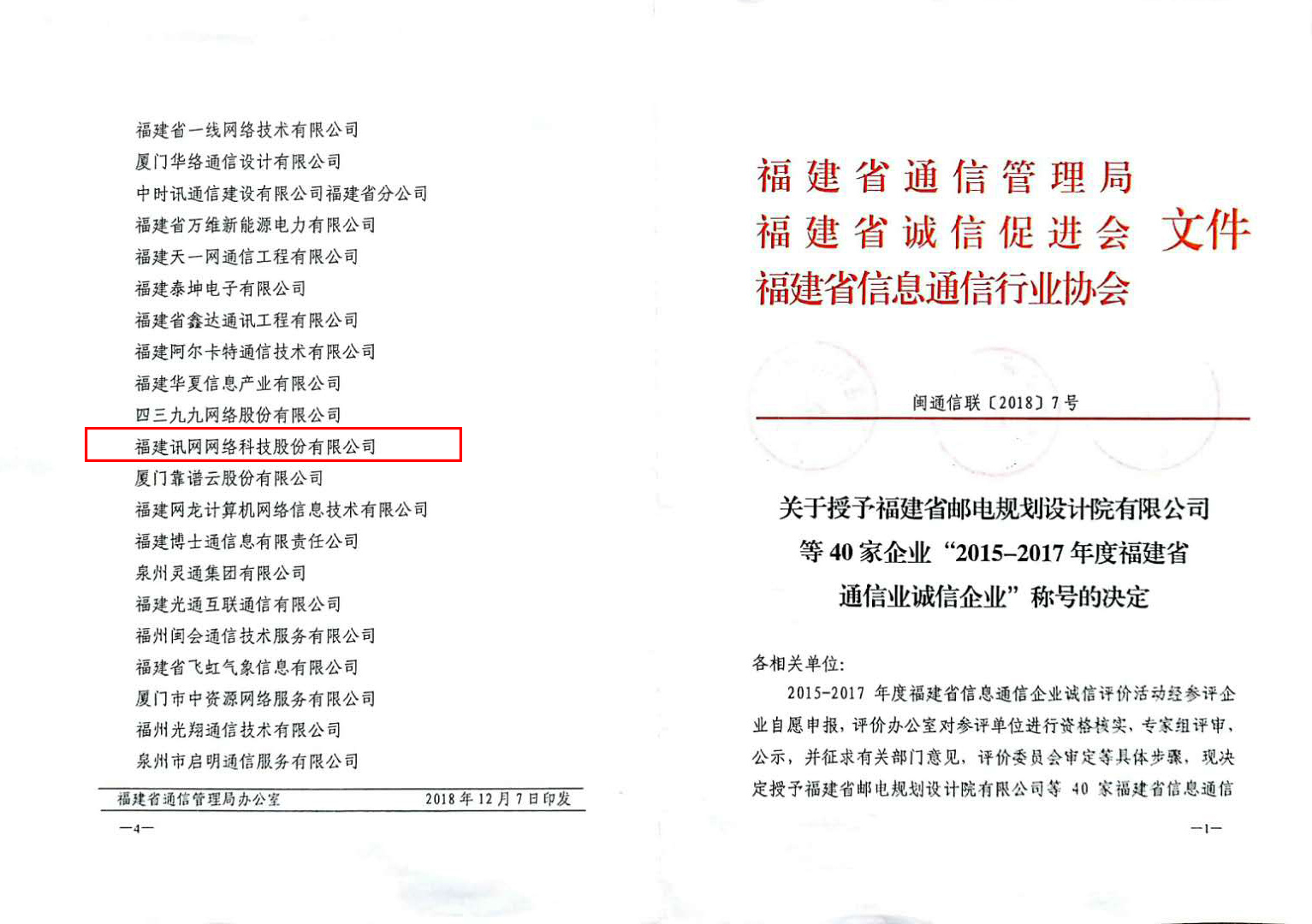 • 訊網榮獲“2015-2017年福建省信息通信業誠信企業”